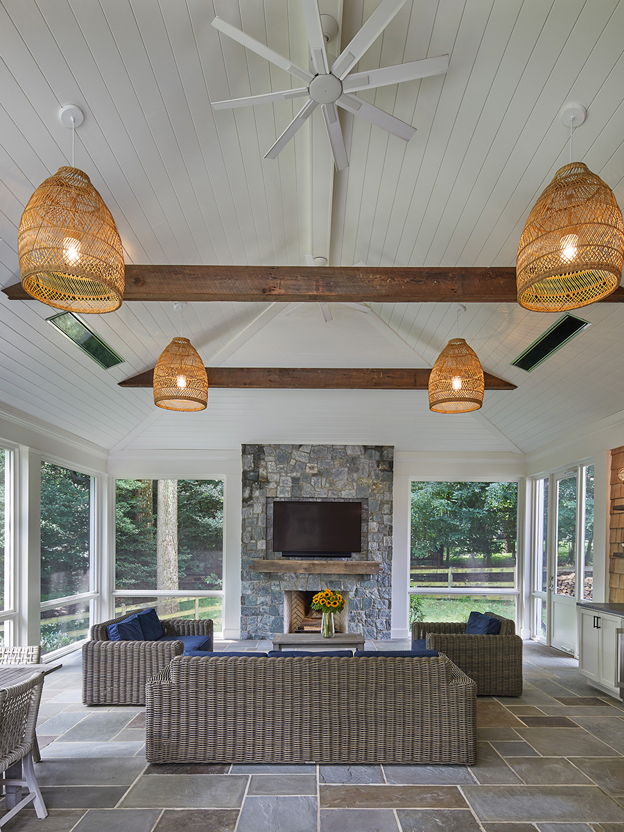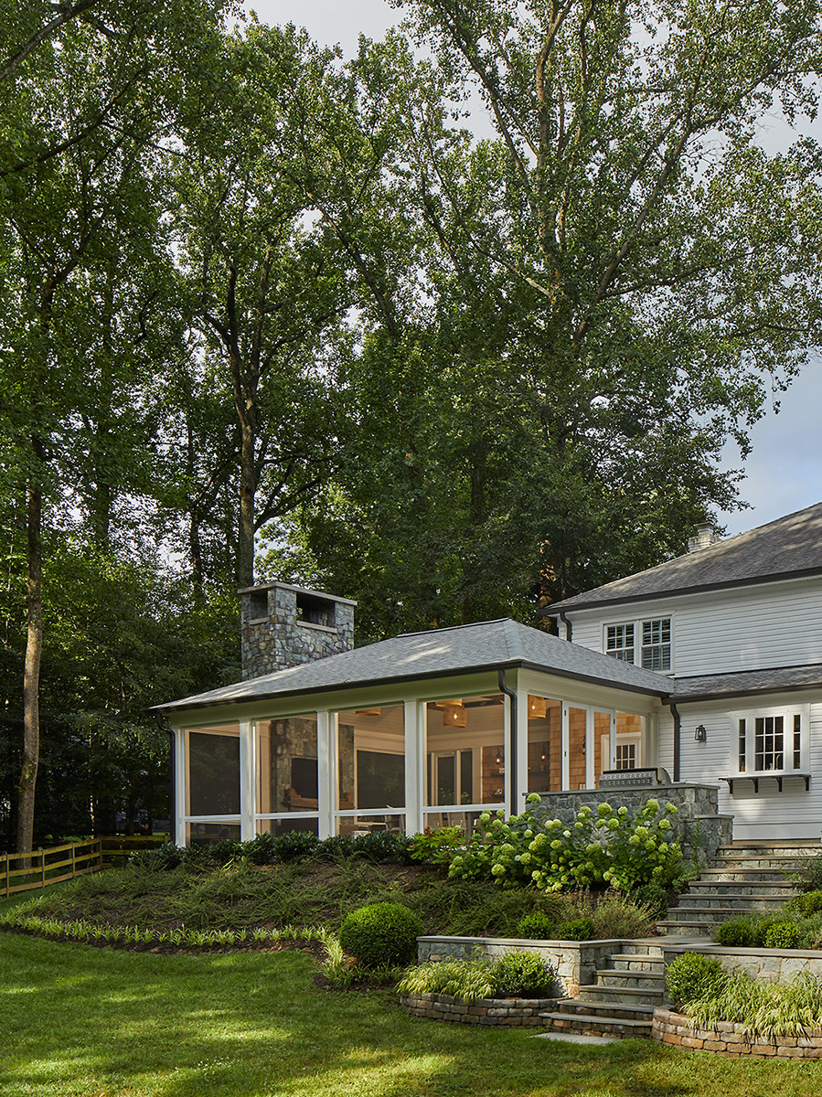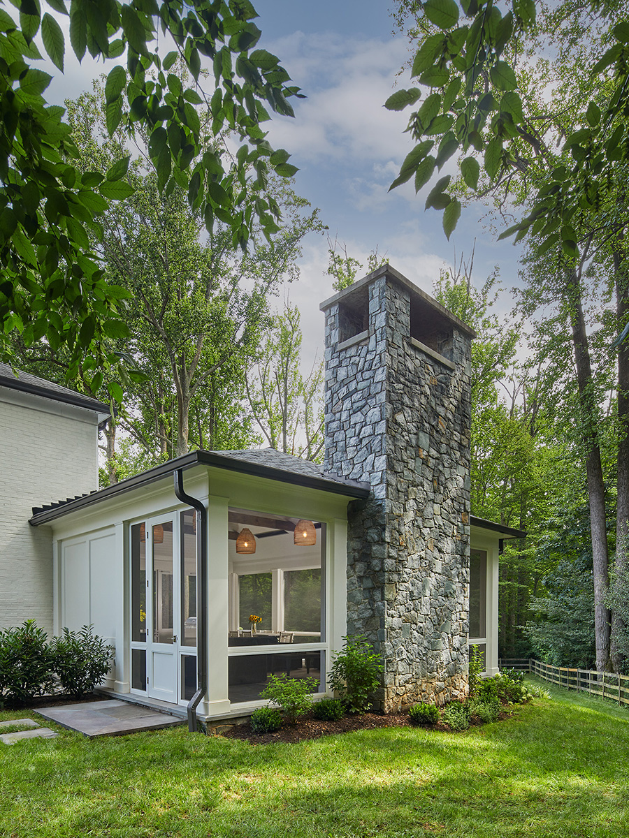 This screen porch addition provides a three-season retreat overlooking the back yard and surrounding woodland. It is accessed from the existing dining room and situated to preserve views from the living spaces and kitchen. Spacious enough for both lounging and dining, it features a stone fireplace and radiant heaters for extended use in fall and winter.