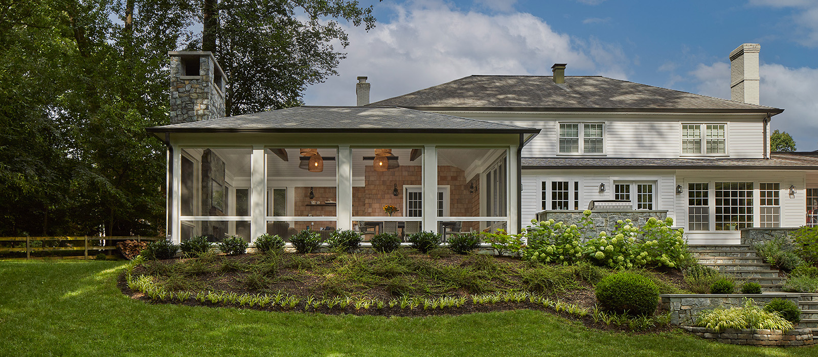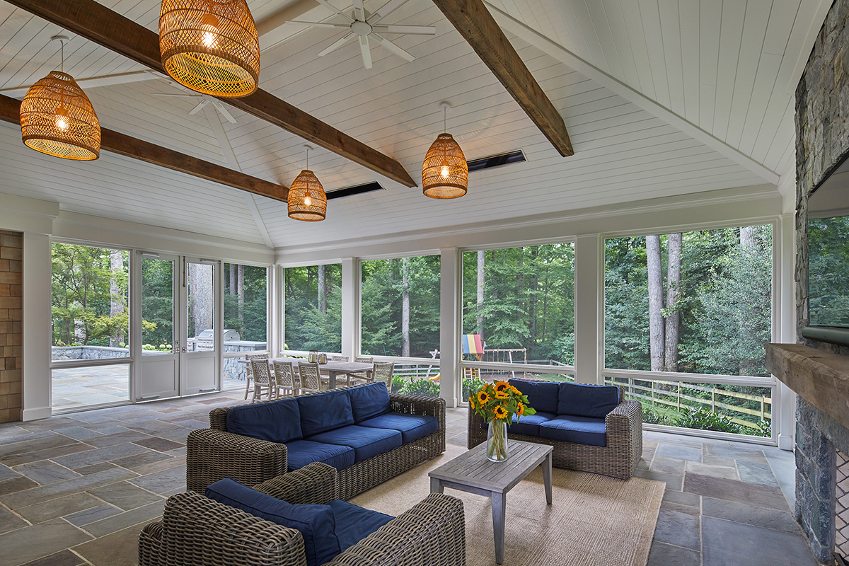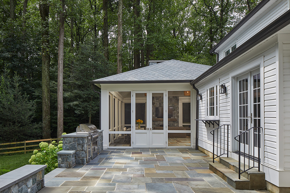 This screen porch addition provides a three-season retreat overlooking the back yard and surrounding woodland. It is accessed from the existing dining room and situated to preserve views from the living spaces and kitchen. Spacious enough for both lounging and dining, it features a stone fireplace and radiant heaters for extended use in fall and winter.